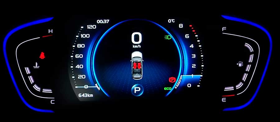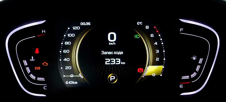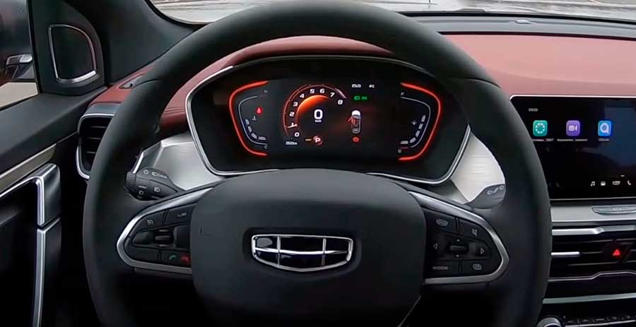 Осталось рассмотреть водительское место Geely Coolray и чем оно сможет порадовать покупателя. Как и салон автомобиля, здесь многое зависит от комплектации и страны поставки кроссовера. В частности панель приборов может быть аналогово-цифровой или полностью цифровой. В первом случае по центру расположился 3,5″ цветной дисплей бортового компьютера, с выводом множества параметров.