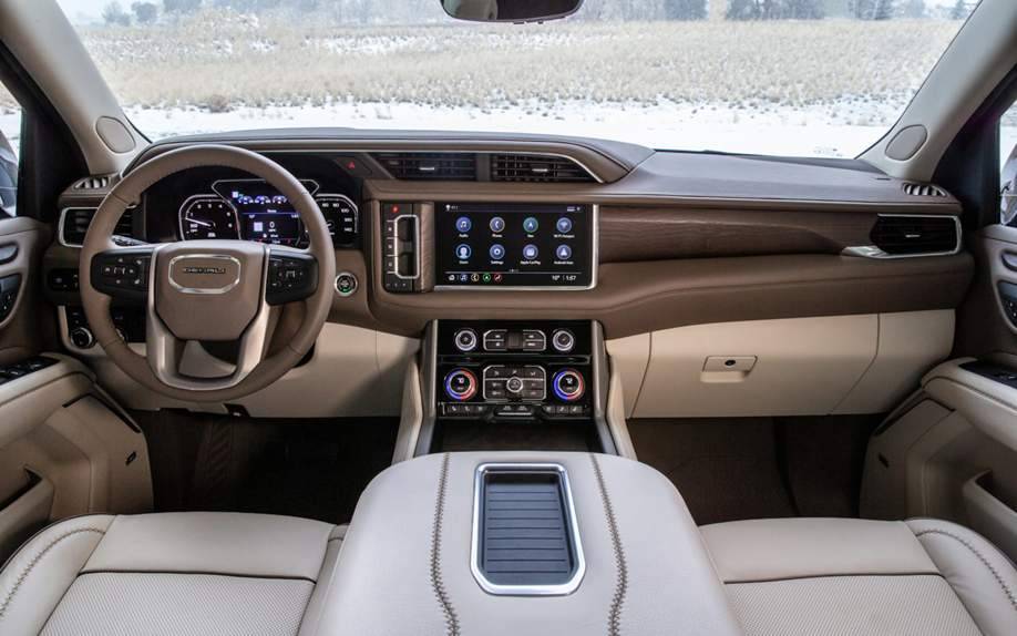 Салон нового GMC Yukon также оригинальный и довольно сильно отличается от интерьера Tahoe/ Suburban. Передняя панель с длинным козырьком, прикрывающим панель приборов и экран мультимедийной системы. Высоко расположенные центральные дефлекторы вентиляции. Стильное мультифункциональное рулевое колесо, оригинальное оформление приборной панели, более дорогие материалы отделки. Большой бокс Power Sliding Center Console, установленный между передними сиденьями, со способностью двигаться назад аж на 254 мм (опция).