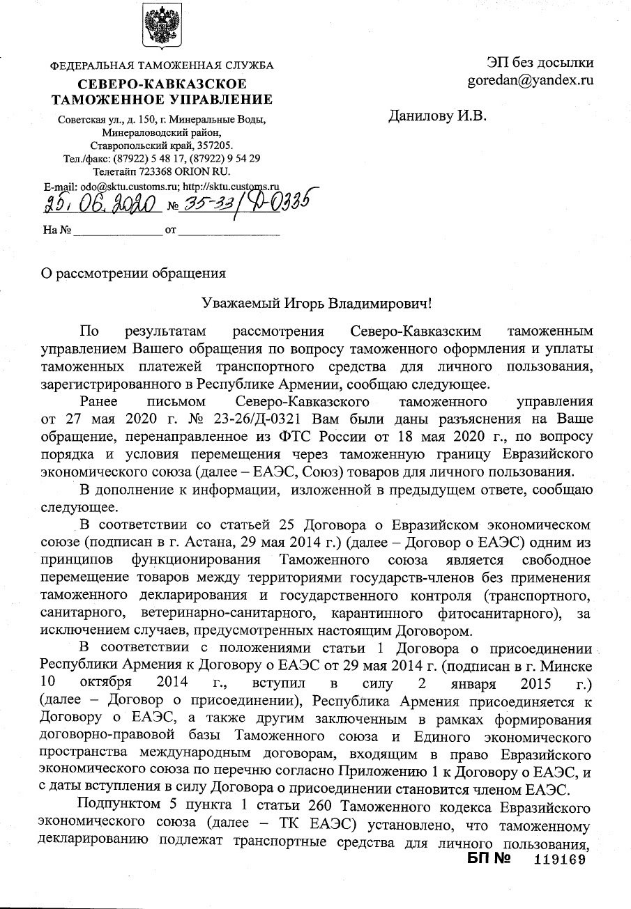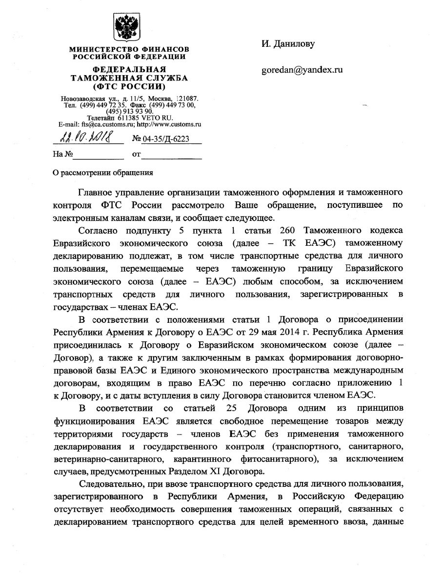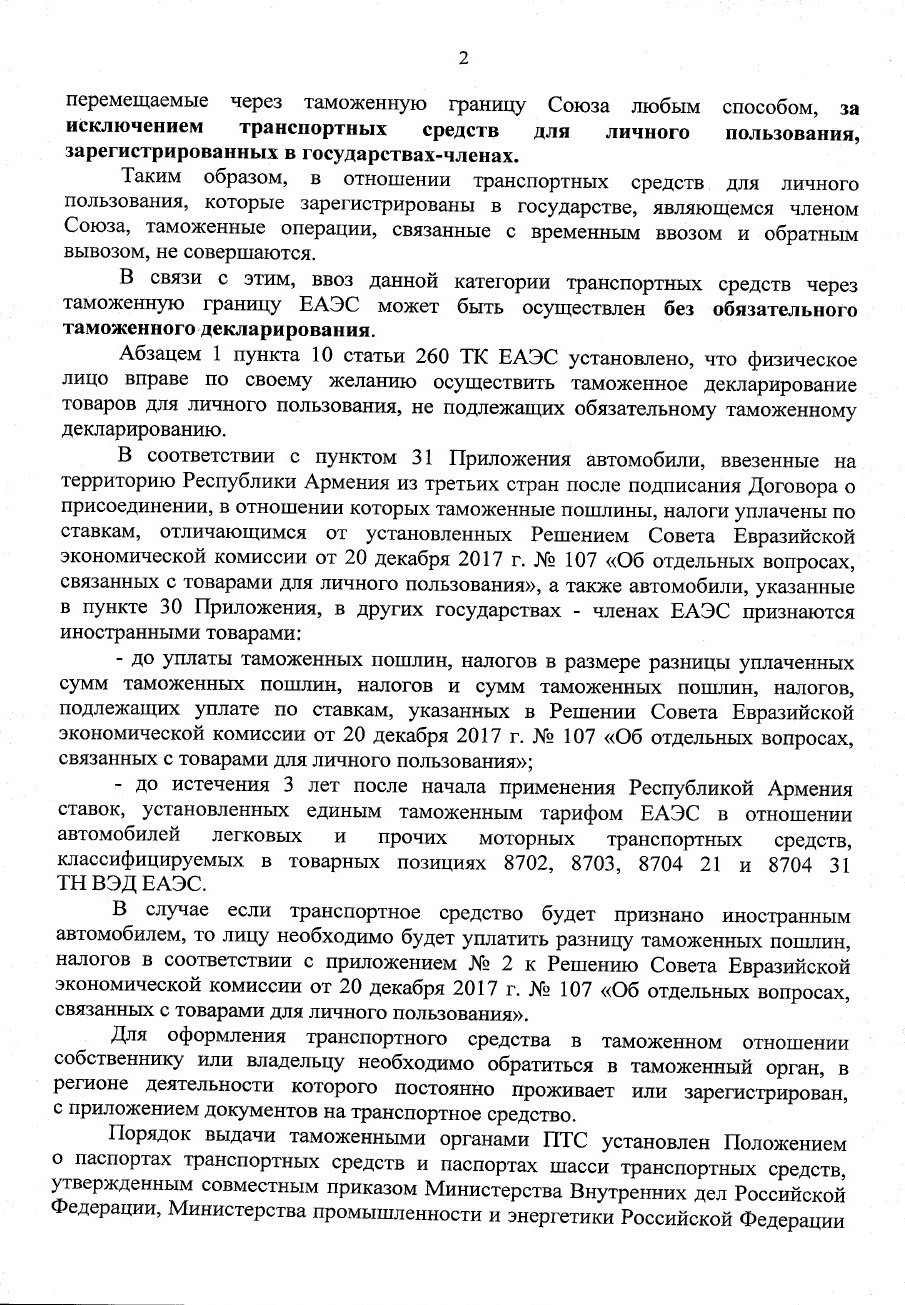 Однако, в 2020 году ФТС изменила свое мнение, хотя в законодательстве формально ничего не изменилось. В официальном письме таможня сообщает, что авто с армянскими номерами считаются иностранным товаром, и владелец обязан уплатить разницу в таможенной пошлине и налогах.