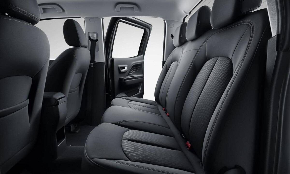 Салон китайского пикапа достаточно простой и не сильно выделяется на фоне других современных автомобилей. На центральной панели привычно размещается большой экран системы мультимедиа, а также блок управления климатической установкой. Салон автомобиля выполнен преимущественно в темных тонах, что в свою очередь показывает на практичность, которую в первую очередь преследовали разработчики. Отдельно в данном случае можно выделить привычную приборную панель, которая получила интересный центральный дисплей и стандартные шкалы приборов.