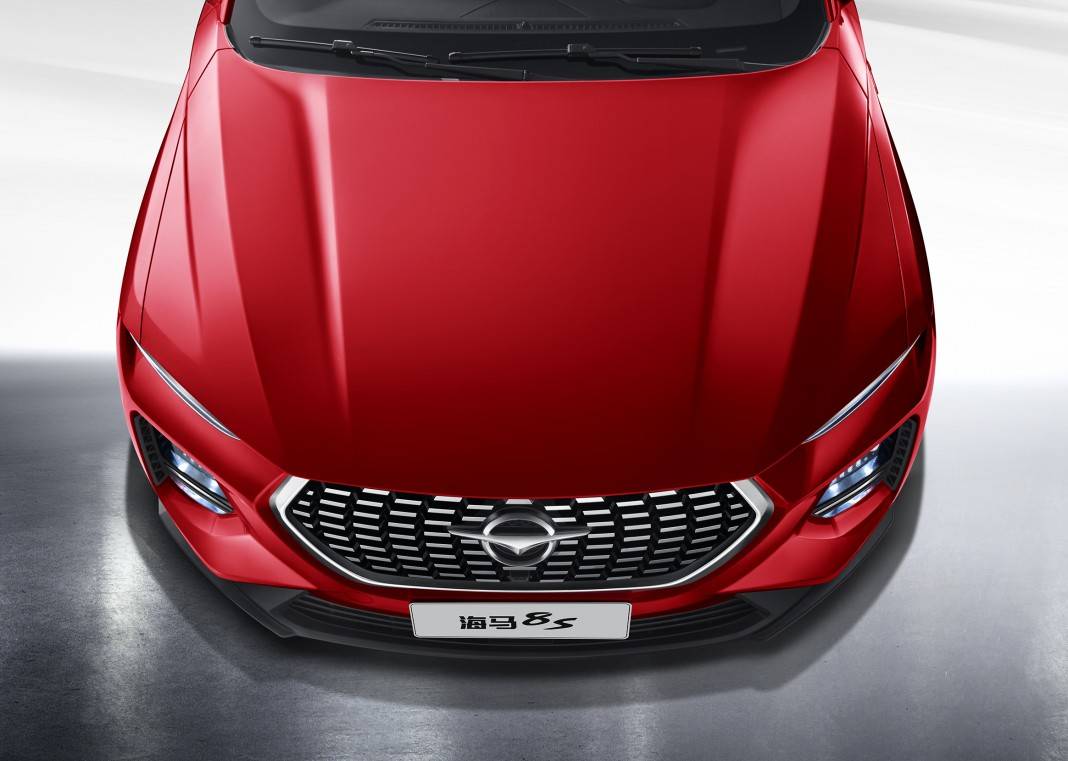 На фото во фронтальной проекции обновленный кроссовер Haima 8S 2019 достойно демонстрирует черный глянцевый периметр ветрового стекла, дополненные волновыми рельефами боковины слегка наклонного капота, декорированный серебристыми накладками и крупным логотипом шестиугольник радиаторной решетки.