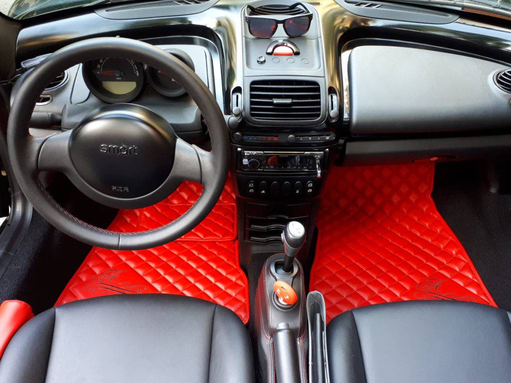 Внутри ручки на дверях СМАРТ Roadster с металлическими вставками. Вставки из перфорированной кожи на дверях и торпеде. Ключ зажигания вставляется в специальное отверстие возле селектора коробки передач. Центральный тоннель отсутствует как таковой, внизу под торпедой большой подстаканник и пепельница. Если опустить козырек для защиты от солнца, то обзорность лобового стекла будет значительно снижено, он закрывает ветровое стекло почти до середины.