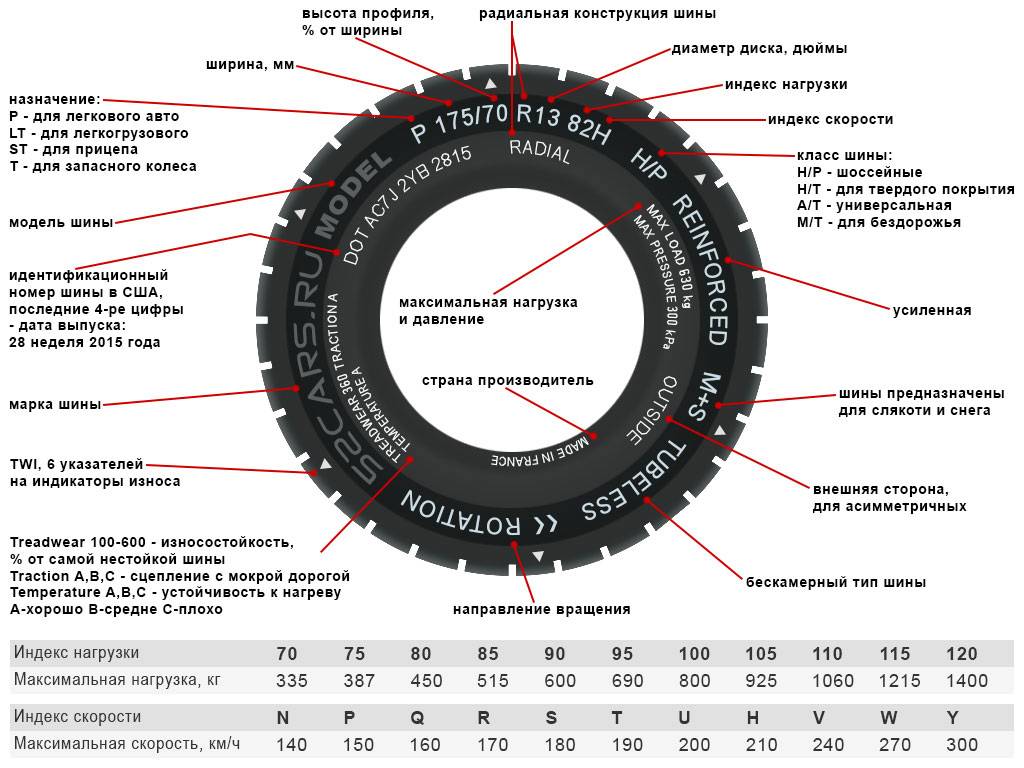 обязательно стоит обратить внимание на показатели предельно допустимой скорости и нагрузки. Их обозначение идет сразу после размерности колеса