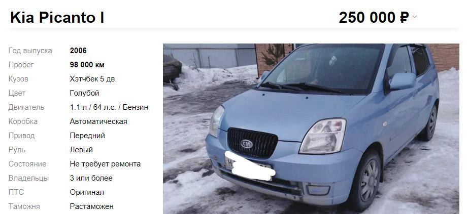 Разброс цен значительный — от 200 тысяч за I поколение до 550 000 тысяч за II. За «Пиканто» 2006 года с пробегом 98 тыс. км просят 250 тыс. рублей: