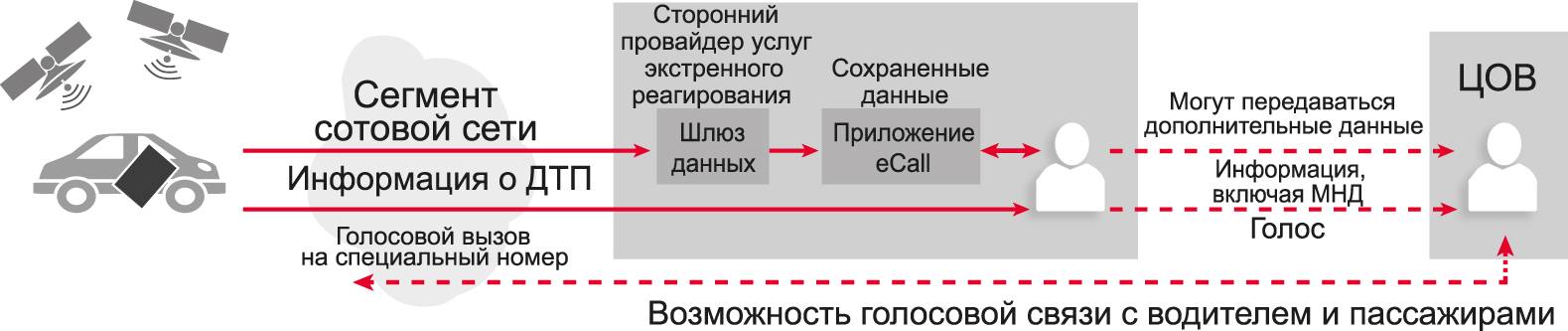 Европейский союз принял план, согласно которому начиная с апреля 2018 года все выпускаемые на его территории автомобили должны комплектоваться бортовой системой экстренного реагирования. Российская государственная система экстренного реагирования ЭРА-ГЛОНАСС полностью совместима с системой eCall. С 1 января 2017 года все продаваемые на территории РФ автомобили обязательно комплектуются модулем системы ЭРА-ГЛОНАСС. Для передачи информации о ДТП и транспортном средстве (ТС) обе системы используют сети сотовой связи 2G или 3G, а также систему спутникового позиционирования. Принцип работы системы экстренного реагирования при ДТП показан на рис. 1.