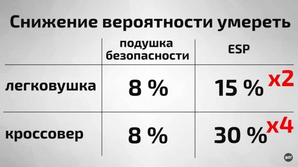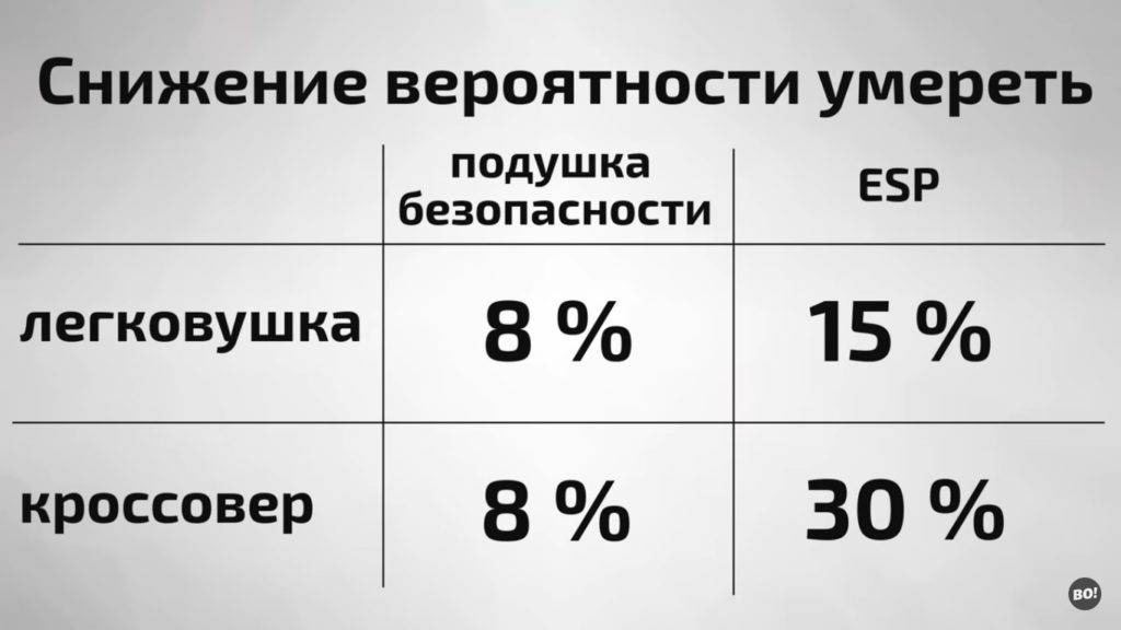 ESP – одна из самых важных систем в автомобиле. Если вам дорога безопасность, покупайте машины только с ней. Она не только снижает риск смерти, но и экономит много денег, предотвращая мелкие и средние аварии. Если у вас спрашивают совет, какую машину купить, посоветуйте купить с ESP. Но не забывайте, что эта система только снижает вероятность аварии, а не исключает ее совсем. Не зависимо от того есть ESP или нет, на машине должна стоять хорошая резина, а скорость соответствовать погоде. В последние годы появились еще более продвинутые системы. Теперь машины могут автоматически тормозить, самостоятельно контролировать полосу или даже брать на себя все управление в режиме автопилота. Но пока это доступно немногим, поэтому берите машины хотя бы с ESP.
