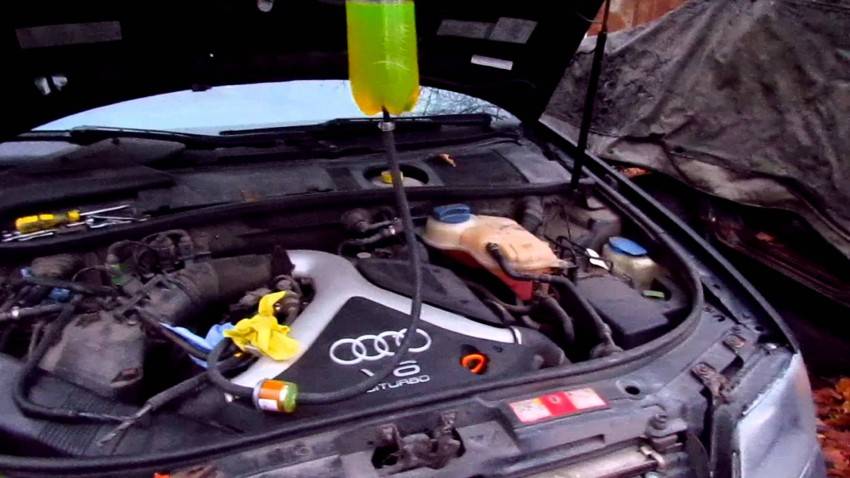 Чтобы промыть форсунки не снимая их с двигателя, сначала запустите двигатель и прогрейте его до рабочей температуры. После этого нужно снизить давление в топливопроводе. Для этого отключите от бензонасоса питание или массу и запустите мотор. Когда давление в бензопроводе сравняется с атмосферным, двигатель перестанет работать. Теперь снимите шланг бензопровода с металлической трубки, прикрепленной к кузову машины. Вставьте в него выход топливного фильтра приспособления для промывки форсунок и затяните на краю шланга хомут. Снимите пробку с бутылки и залейте в нее средство для промывки форсунок. Накрутите пробку обратно и затените ее. Наденьте шланг подкачки компрессора на вентиль в дне бутылки. Бутылку подвесьте на открытый капот горлышком вниз. Включите компрессор и создайте внутри бутылки давление около 3 кг/см2. Теперь, когда в форсунки вместо бензина поступает промывка нужно запустить двигатель. Он будет работать на ней как на бензине. Чтобы промыть форсунки, нужно сжечь около литра промывочной жидкости. После 15 минут работы двигателя на холостом ходу нужно заглушить двигатель и подождать 15 минут, чтобы засоры как можно лучше намокли. Потом запустить мотор, и дожечь жидкость.