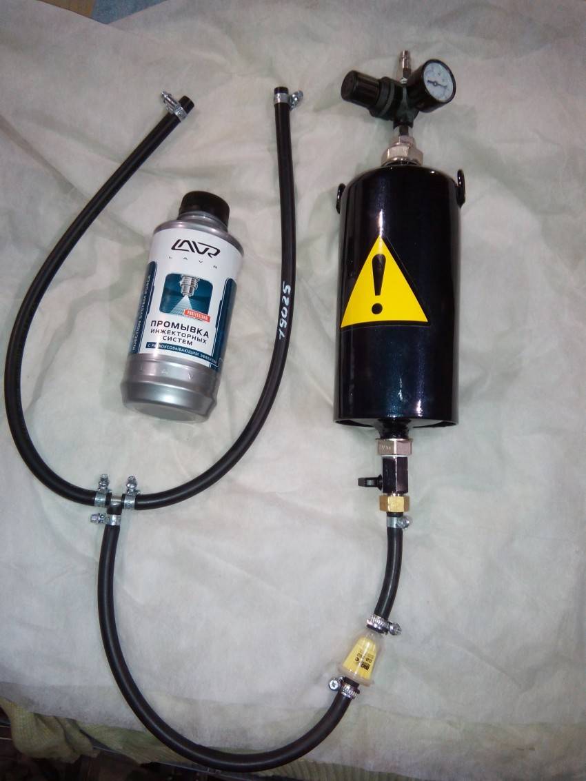Чтобы промыть форсунки своими руками не снимая их с двигателя, нужно сделать приспособление для подачи к ним промывочной жидкости под давлением. Для этого понадобится: