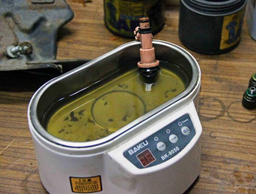 - Для очистки от несмываемых налетов или различного вида нагаров детали инжектора помещают в специальную ванну, где производят полную очистку с помощью ультразвука. Время пребывания деталей и узлов в ультразвуковой ванне напрямую зависит от степени загрязнения и должно быть достаточно, чтобы полностью убрать налет смолистых отложений с узлов и корпуса форсунки.