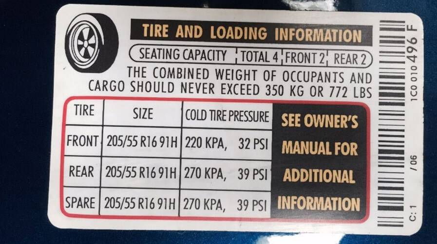 Кроме этого, информацию дублирует наклейка (шильдик) на стойке в водительском дверном проёме. В табличке указаны: типоразмер шин, габариты дисков и давление воздуха. Иногда, наклейка размещена в дверном проёме пассажира или на внутренней стороне лючка бензобака. Единица измерения давления, может быть указана: в барах (Bar), килопаскалях (kPa) или в фунтах (PSi).