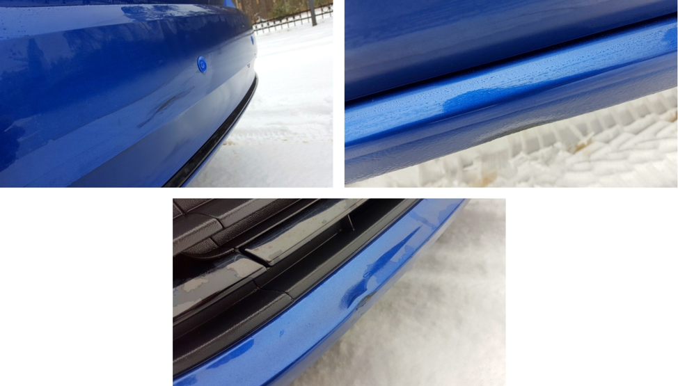 Лёгкая притёртость на заднем бампере, небольшая замятость на правом пороге от бордюра, парковочный тычок в юбку переднего бампера.