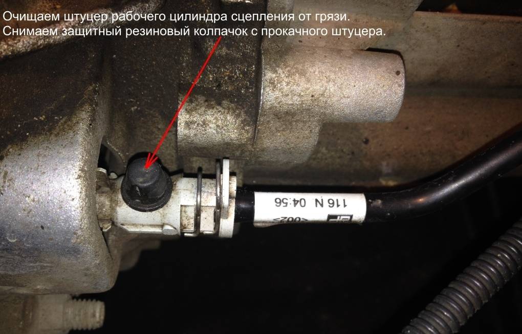 - Далее отвинчиваем штуцер прокачки еще приблизительно на пол-оборота и закручиваем клапан, отпуская при этом педаль сцепления. Делать это нужно пока жидкость не избавиться полностью от пузырей.