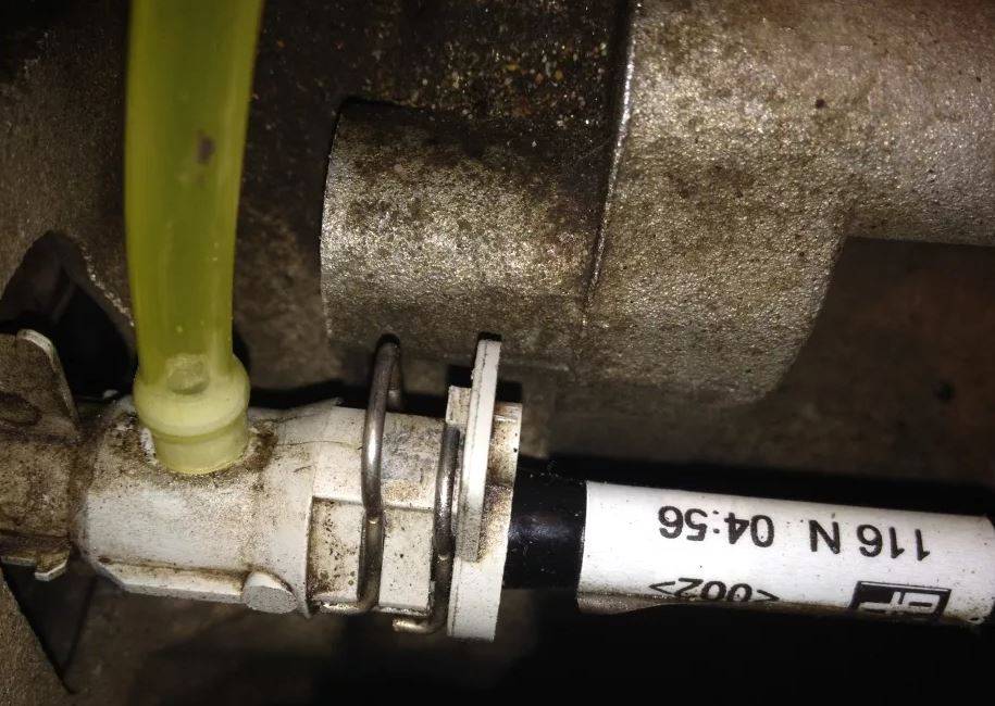 - Откручиваем немного клапан (не на полный оборот), придерживая ключом штуцер переходника от основного цилиндра привода выключения. Когда вы это сделаете, в резервуар начнем выливаться старая тормозная жидкость (она будет иметь воздушные пузыри).