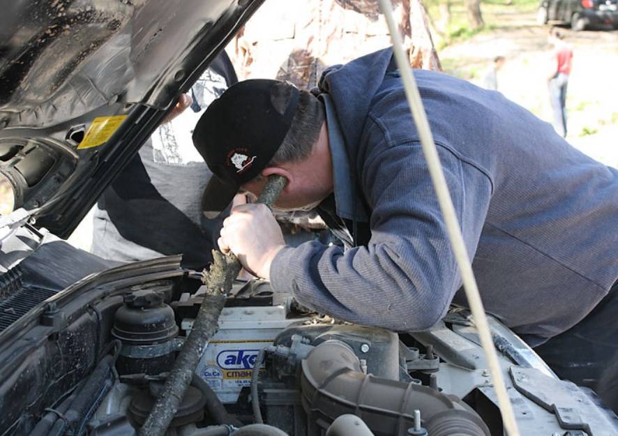 Для прослушивания подшипников потребуется пруток или рейка. Методика проверки следующая — в генератор упирают металлический пруток, другой конец подносят к уху и при запущенном двигателе слушают. Делается это примерно вот так: