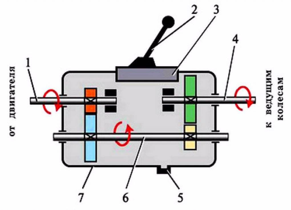 При переключении передач рычаг вначале переводится в нейтраль, из которой производится выбор нужного режима. За это время синхронизатор выравнивает угловые скорости, и шестерня блокируется муфтой. Крутящий момент с первичного вала передается на вторичный и далее через главный редуктор на ведущие колеса.