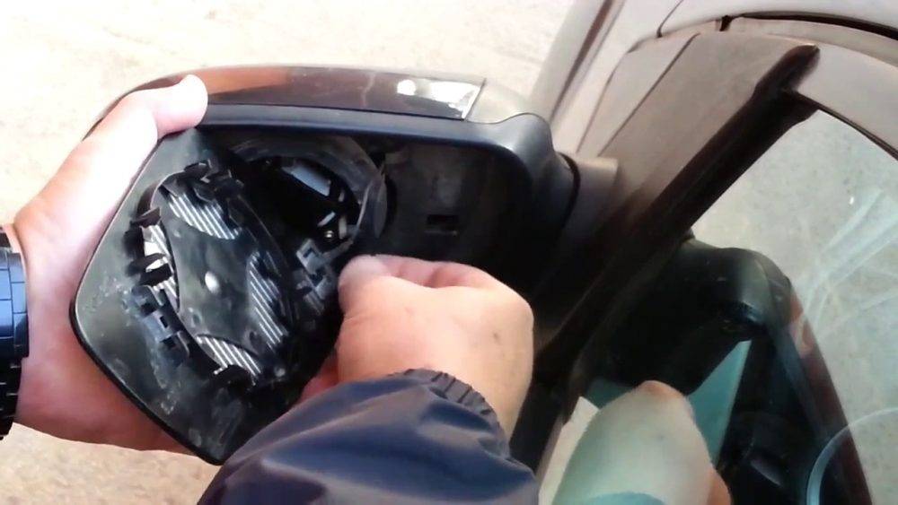 Ставить зеркало на место всегда намного проще. Греть здесь ничего не нужно. Стоит правильно совместить защелки, что обычно труда не составляет и с усилием надавить на отражающую пластину.