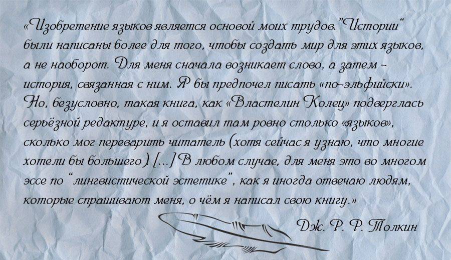 Впрочем, сочинение сказок для своих детей нельзя назвать бесполезным хобби. Вся соль в другом: что побудило Толкина взяться за это дело? Когда Джону было еще 13 лет, он начал придумывать свои собственные, вымышленные языки. И лингвистом Толкин стал не случайно. «Хоббит» и «Властелин колец» соединили в себе эти вымышленные языки, став следствием этого необычного увлечения. Вот что сказал о своем хобби сам Джон Толкин: