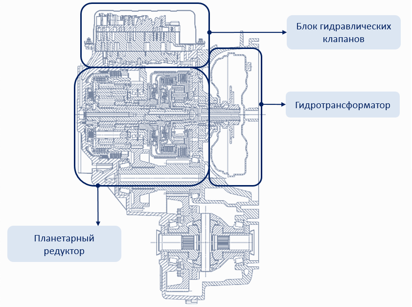 Автоматическая КПП состоит из двух основных компонентов: гидромеханического узла и системы управления. Как нетрудно догадаться, первый выполняет основную работу – передает от двигателя к ведущим колесам крутящий момент, а вторая определяет порядок работы.