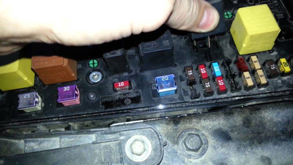 Коробка с реле и предохранителями расположена слева от двигателя за куполом стойки амортизатора. Предохранитель бензонасоса имеет голубой цвет, реле — чёрный.