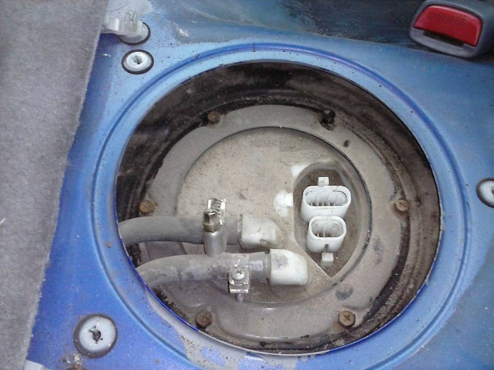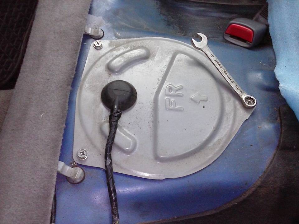 На форумах рекомендуется хотя бы раз в год проводить подобные инспекции. Симптомы забитой сеточки бензонасоса: тупление автомобиля при переключениии передач, автомобиль плохо набирает скорость, провалы на ХХ, вплоть до того, что машина глохнет. Нерадивые сервисмены, в зависимости от полета фантазии могут вам посоветовать заменить: бензонасос (1500 р), почистить инжектор промывкой (1200, а со снятием 1500-1600), заменить MAF-датчик (а на наши малышки он новый по экзисту 42000) и т.п. Кстати, забивание сеточки бензонасоса — болезнь демии распространенная. Если не охота ее чистить, то подойдет сеточка от ВАЗ 2110. Только при установке ее нужно будет развернуть на 180 градусов, иначе рама бензонасоса не встанет в положенное ей положение. Итак, решено — снимать, смотреть и при необходимости чистить! Для этого выкидываем все барахло из багажника, отодвигаем передний ряд сидений до упора вперед. Складываем и откидываем задний ряд сидений. Снимем обивку пола и багажника. Прямо под сиденьями, в их обычном положении видим квадратный лючок с подведенной к нему электоропроводкой. Снимаем лючок, для этого крестовой отверткой отвинчиваем болты крепления. Болты вывернуты, лючок сдвинут, насколько позволяет ппроводка. Перед нами верхняя часть станины бензонасоса, законтренная на 6 болтов под крестовую отвертку (4х8 вроде как). Сверху станины разъем папа-мама. Снимаем разъем. К бензонасоссу подходят подводная и отводная трубки