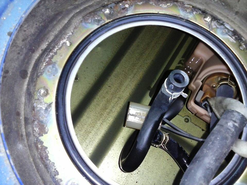Используя имеющийся г-образный подвод от старого бензинового фильтра заглушаем их (очень важно помнить, что топливная система при исправном перепускном клапане находится под высоким давлением, перед началом работ по снятию бензонасоса чтобы выровнять давление в системе — откройте лючок бензобака и открутите заливную пробку с горловины бензобака) Напоминание! Вы работаете с огнеопасной средой. Соблюдайте элементарные правила безопасности. Например, очень плохая идея при снятом бензонасосе подсвечивать себе зажигалкой