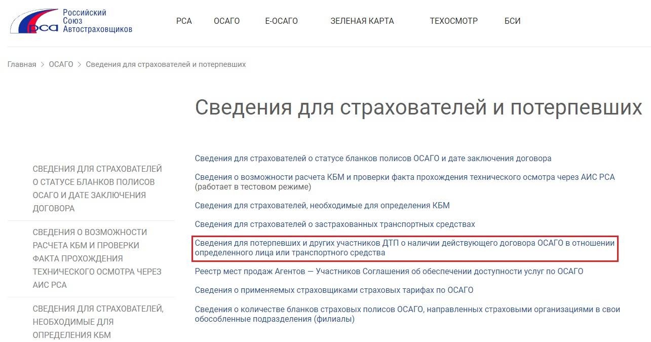 — в меню справа нажмите на «Сведения для потерпевших и других участников ДТП о наличии действующего договора ОСАГО в отношении определенного лица или транспортного средства»