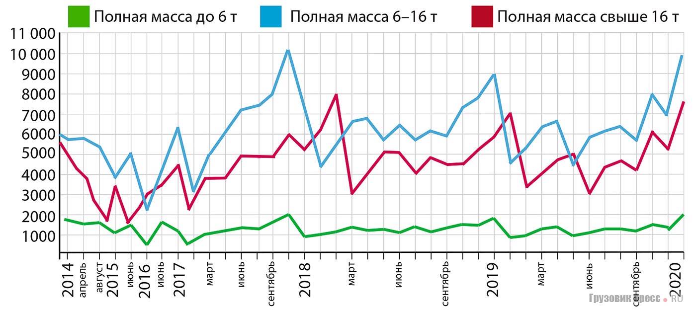 Продажи на внутреннем рынке среднетоннажных и крупнотоннажных грузовиков (MCV+HCV) за 12 месяцев 2019 года по данным ООО «Автостат Инфо» составили 78,8 тыс. (–2,3%), а по LCV (категории N1 и M2, т.е. включая микроавтобусы) – снизились на 1,9%, до 104,2 тыс. Суммарно рынок грузовиков в 2019 году составил 183 тыс. (–2,1%). Из них на долю отечественных марок пришлось 113,8 тыс. (+2,3%), на долю иномарок – 69,2 тыс. (–8,7%). Реальная рецессия экономики, в том числе из-за снижения среднегодовых цен на природный газ и нефть, совпала с завершением нацпроекта по Крымскому мосту. В 2020 году намечено строительство скоростной трассы М-12 «Москва–Казань», реконструкция трасс М-7 и М-5 и завершение ЦКАД. Рост утилизационного сбора (играющего роль заградительного барьера для импорта), несколько подстегнуло спрос на LCV и грузовики с автобусами на рубеже 2019–2020 года. Но рецессия мировой экономики, связанной с пандемией коронавируса COVID-19, не придаёт оптимизма.