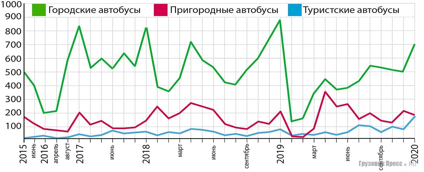 Продажи автобусов полной массой свыше 8 т упали с 8893 до 7623 штук. Однако наблюдалось оживление европейских брендов с 100 до 190 ед. Продажи только автобусов MAN и Neoplan удалось увеличить с 48 ед. в 2018 году до 110 шт. – в 2019-м.
