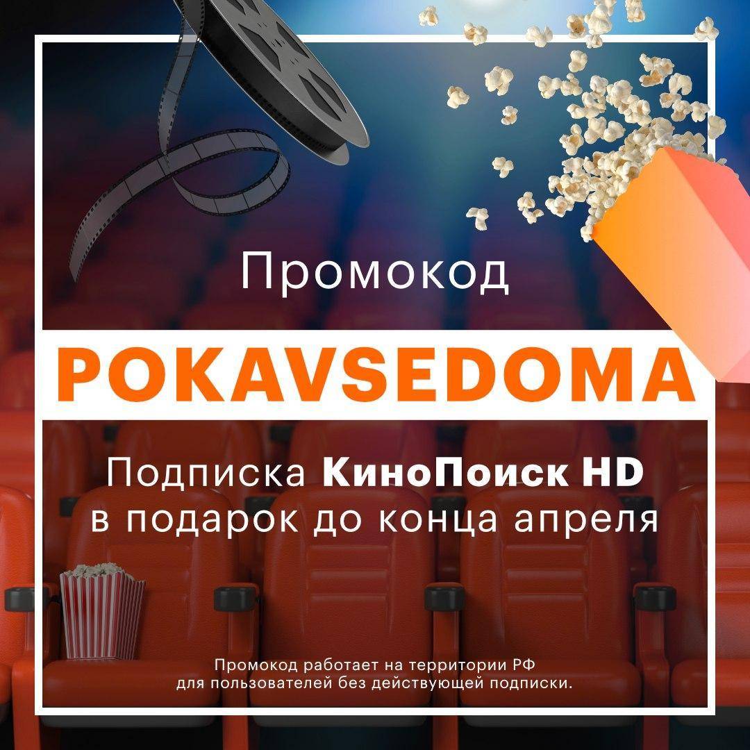 Также кинотеатр «Кинопоиск» позволил получить неактивным пользователям подписку по промокоду «POKAVSEDOMA». Данный код дает возможность любому человеку, кто ранее не был зарегистрирован в сети, получить бесплатную подписку прямо до конца апреля, то есть весь карантин можно наслаждаться бесплатным просмотром на официальных сайтах многих кинотеатров.