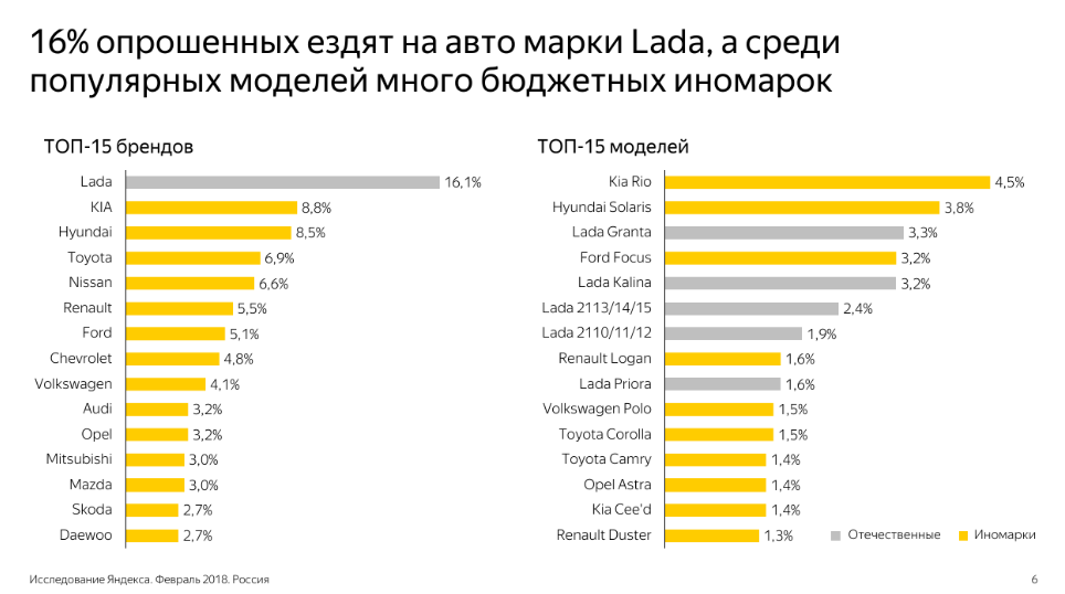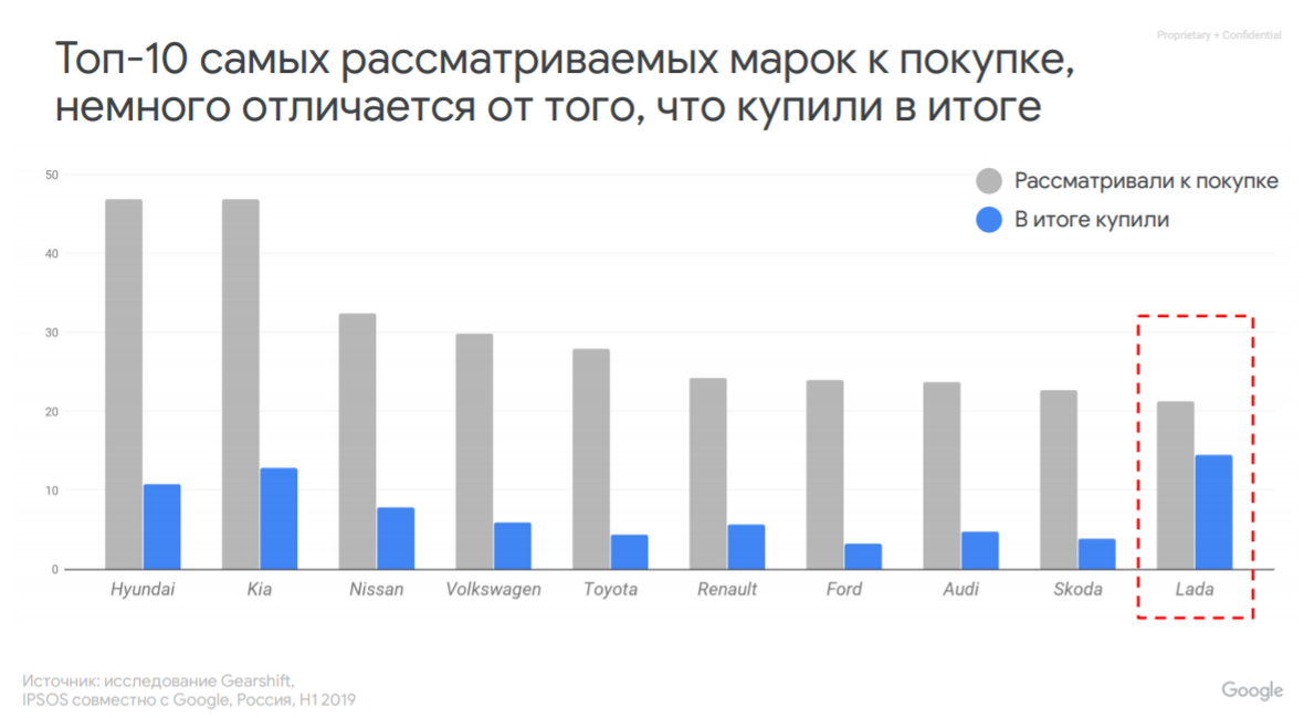 Google среди самых рассматриваемых к покупке марок выделяет Hyundai, Kia и Nissan. Любопытно, что в итоге чаще всего покупают машину марки Lada, хотя в рейтинге рассматриваемости она на последнем десятом месте.