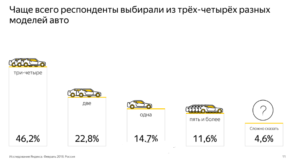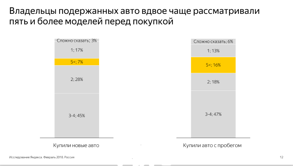 Увеличивается среднее количество вариантов, которые пользователи рассматривают перед покупкой. В 2018 году, по сведениям Яндекса, пользователи чаще всего выбирали между тремя-четырьмя моделями авто. Таких покупателей оказалось 46,2%.