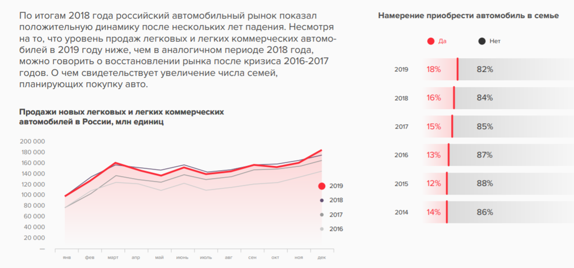 Автомобильный рынок в России последние несколько лет растет. Согласно данным myTarget, в 2019 году 18% семей планировали приобрести авто, а в 2018 и 2017 — 16 и 15% соответственно.