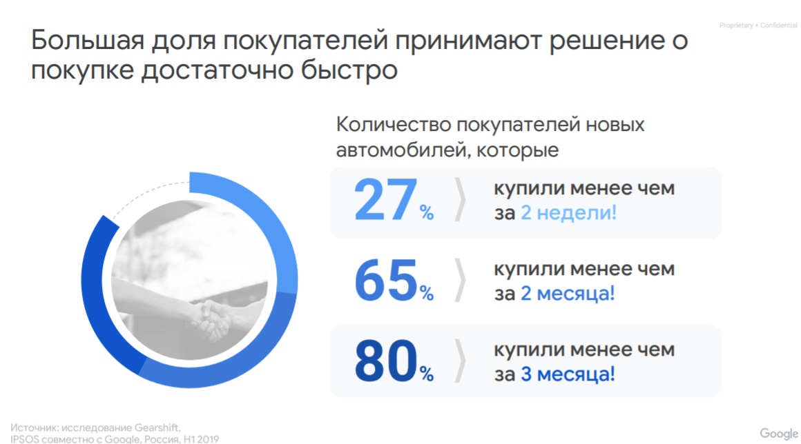 Велика доля покупателей, которые принимают решение очень быстро. Среди респондентов Google 27% купили авто менее чем за две недели.
