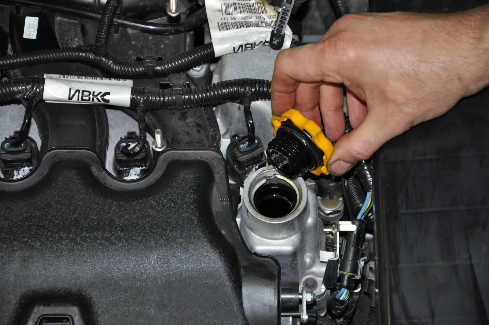 7. Залейте большую часть нового масла, запустите двигатель, дождитесь, пока погаснет лампа уровня масла, и добавьте оставшийся объем.