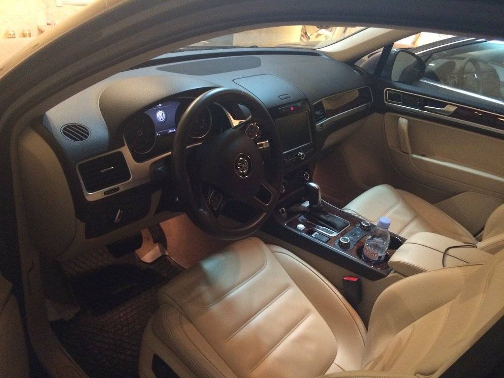 Внутренняя отделка Туарег 2 после рестайлинга стала комфортнее и современнее. Использованы качественные материалы: кожа Bonanza Braun и декор из натурального дерева Ebony. Основные цвета — бежевый St. Tropez, коричневый Natur. Подсветка панели приборов стала белой. Салон просторный, места достаточно и для передних, и для задних пассажиров. Уровень шумоизоляции отличный, подвеска — мягкая.