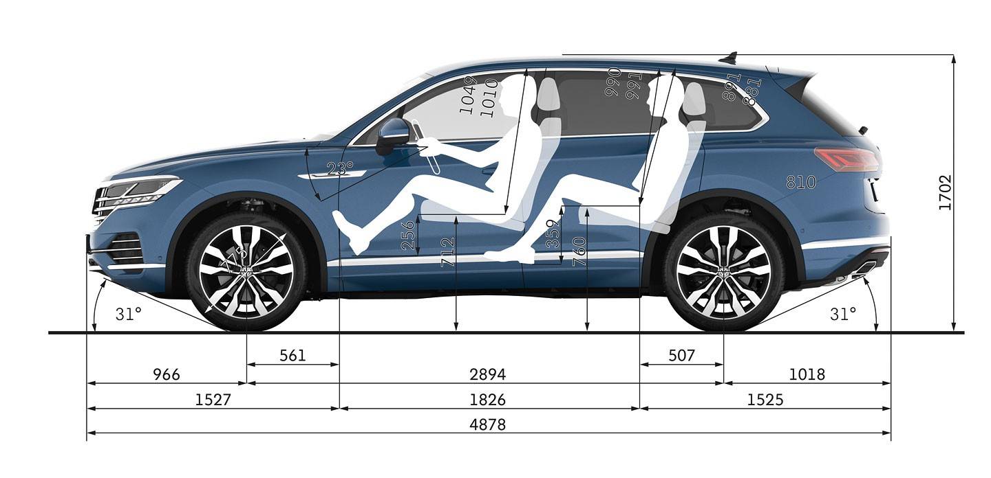 Внедорожный потенциал Touareg тоже неплох: 25 градусов углов съезда/въезда позволяют преодолевать броды глубиной до 49 см., а при использовании опциональной пневмоподвески этот показатель может вырасти до 57 см.