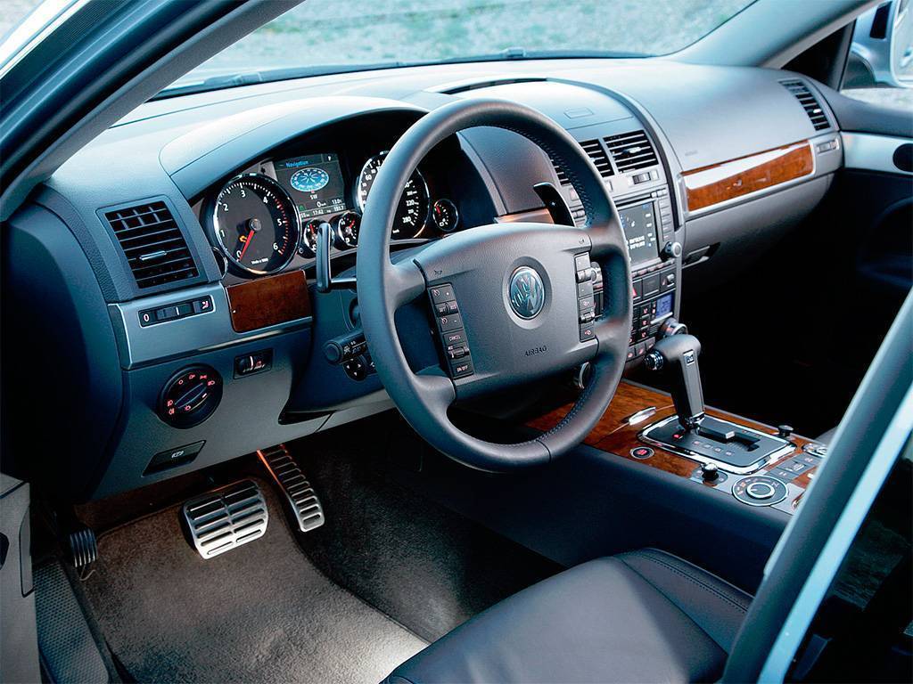 Многие автолюбители отмечают, что первый Туарег по комфортности и дизайну салона напоминает бизнес-класс в самолете. Имеет продуманный, эргономичный интерьер с дорогими материалами обшивки и идеальной шумоизоляцией. Кожа отлично сочетается с деревянными и алюминиевыми вставками, мягким пластиком.