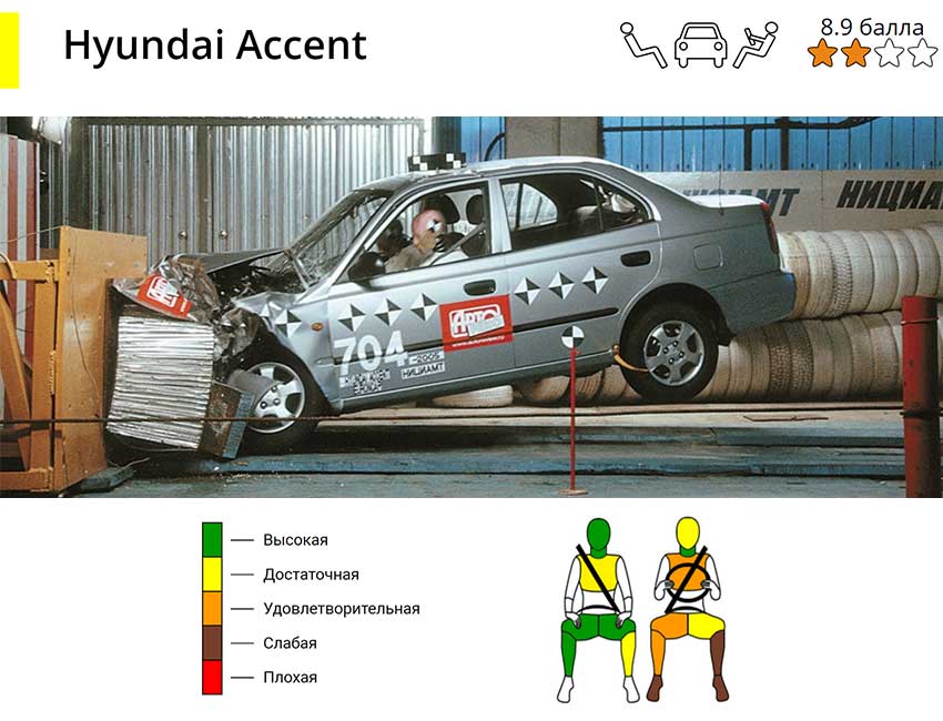 ABS устанавливается только на хэтчбеки, для седана эту опцию придется приобретать дополнительно. По данным проведенных краш-тестов Хёндай Аксент 2008 получил удовлетворительные оценки при боковых и лобовых ударах.