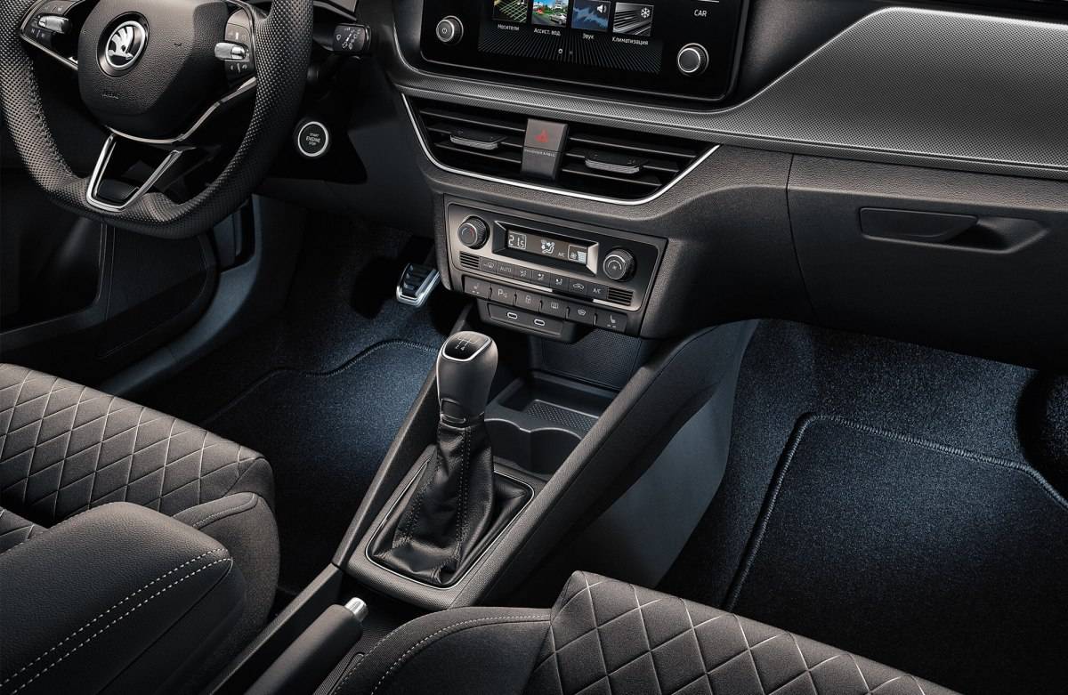 Новый Skoda Rapid практически ничем не отличается внутри от своего немецкого конкурента. Расположение элементов управления практически идентичное. Также на центральной консоли разместился большой экран информационно развлекательного комплекса, присутствует стильная приборная панель, где в центре также установлен небольшой экран для вывода основной информации, а также навигационной системы. Также здесь имеется привлекательный и минималистичный блок управления климатической системой. Автомобиль внутренне никак не отражает внешнее оформление, выполненное в агрессивном стиле. В салоне, напротив, все сделано в умеренном и практичном порядке.