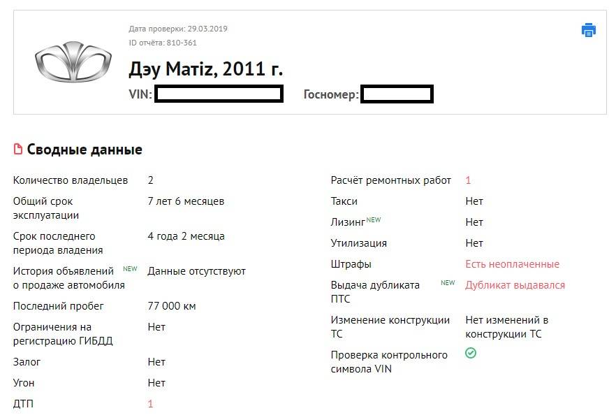 Проанализировав отчеты из базы avtocod.ru по «Матизу», мы выяснили, что «чистым» продавался каждый третий автомобиль. Самые распространенные проблемы — дубликат ПТС (7 из 20), неоплаченные штрафы (4 из 20) и ДТП (4 из 20).