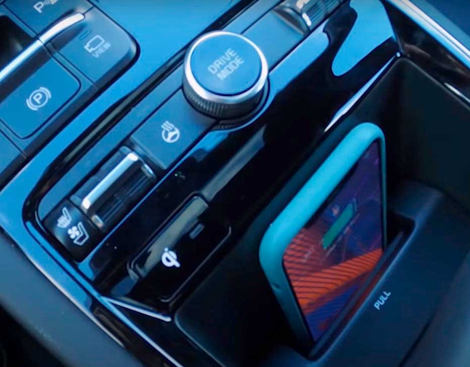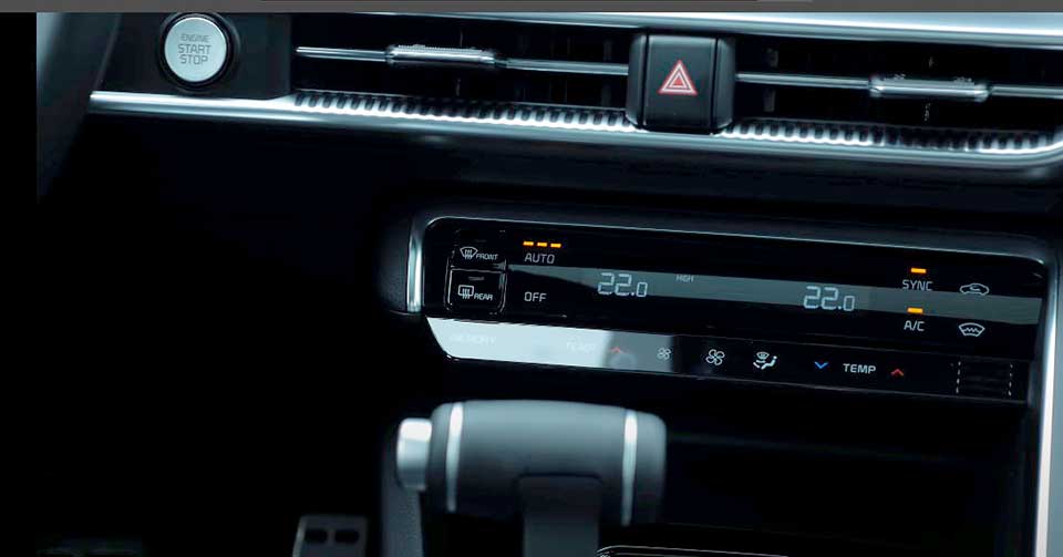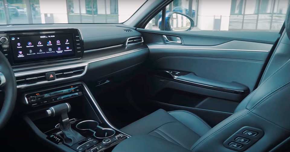 Роль мультимедии КИА К5 2020-2021 выполняет 10,25-дюймовый сенсорный экран посередине торпедо. В базовой комплектации будет обычная магнитола, после 8-дюймовая, а максимальный размер только в топе. На центральной консоли еще расположился блок климат-контроля с сенсорными кнопками.