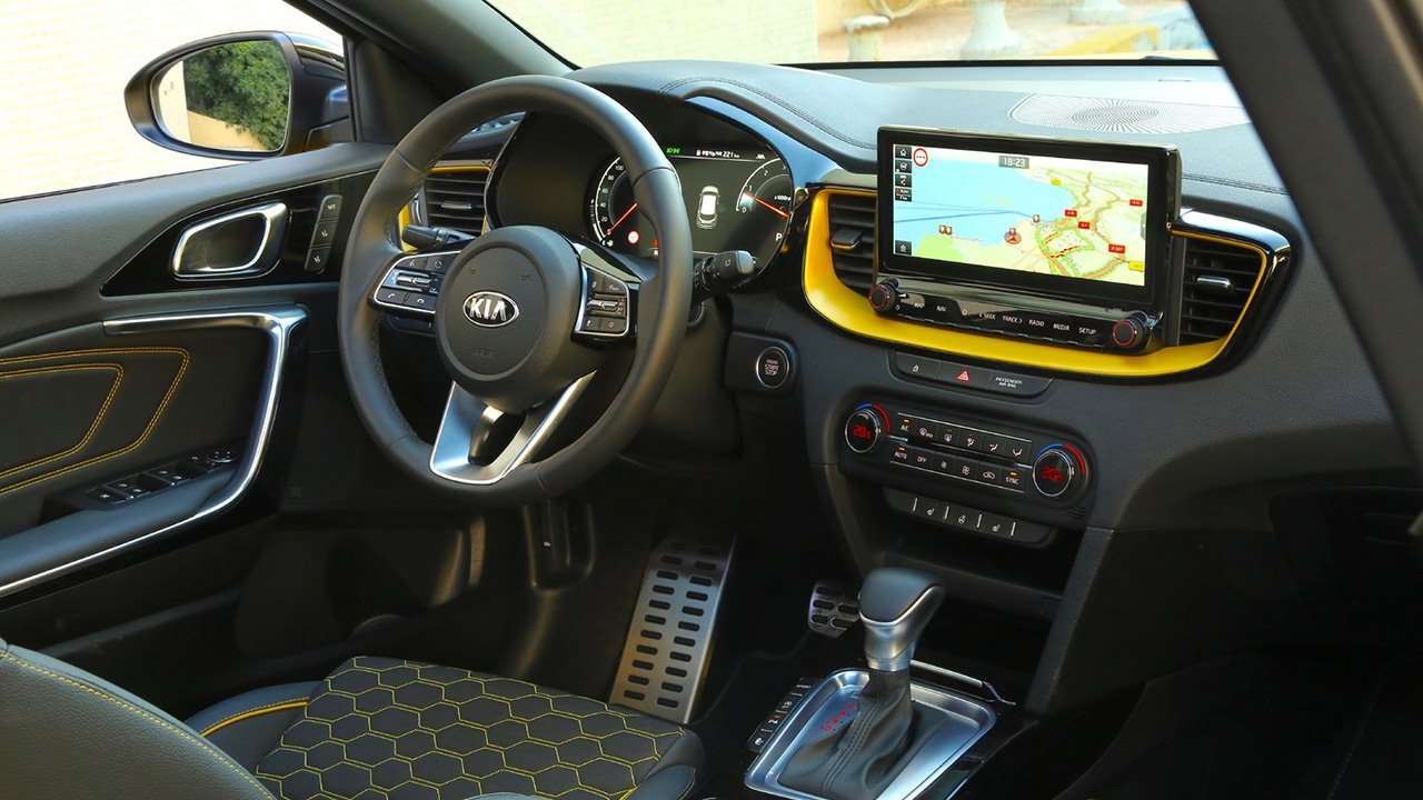 Салон городского кроссовера Kia XСeed имеет знакомую по собратьям компоновку с повернутой к водителю центральной консолью и торчащим над передней панелью мультимедийным дисплеем. В качестве отделочных материалов применяются ткань, а также искусственная и натуральная кожа. Характерной особенностью Икссида являются двухцветные схемы обивки, предусматривающие наличие контрастных элементов декора и швов.