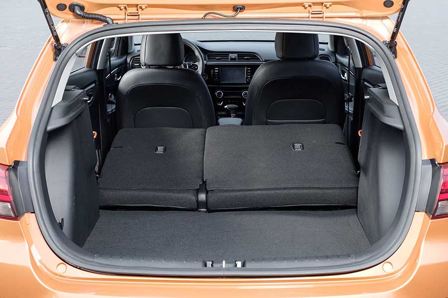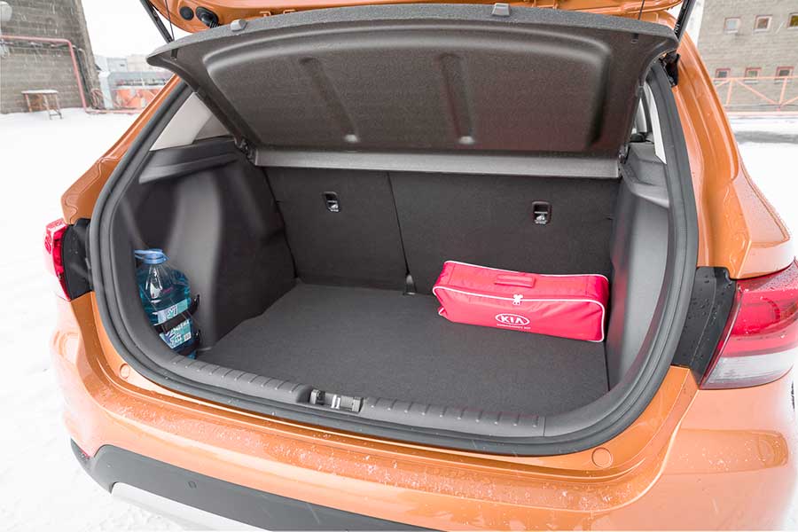 Багажная дверь Рио Х-Лайн при открытии поднимается высоко, оснащена двумя газовыми амортизаторами. Под нижней фальш-панелью, к сожалению, нет никакого дополнительного «подполья», кроме самой полноразмерной запаски, также не предусмотрена в нише и шумоизоляция.