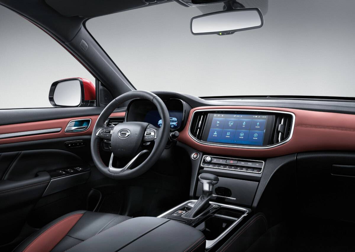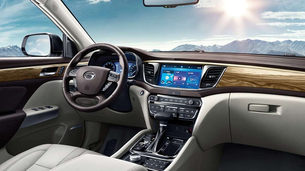 Весьма современной получилась передняя панель кроссовера. В отличие от внешнего вида, салон GAC GS8 стал более оригинальным, по центру расположился 10,1″ дисплей мультимедийной системы. По словам производителя, основой для нее послужила платформа Android Auto с множеством дополнительных функций (точка доступа Wi-Fi, Bluetooth, мобильная связь 4G LTE). Стороны дисплея приукрасили двумя воздуховодами, а саму торцовую часть панели глянцевой, пластиковой накладкой.