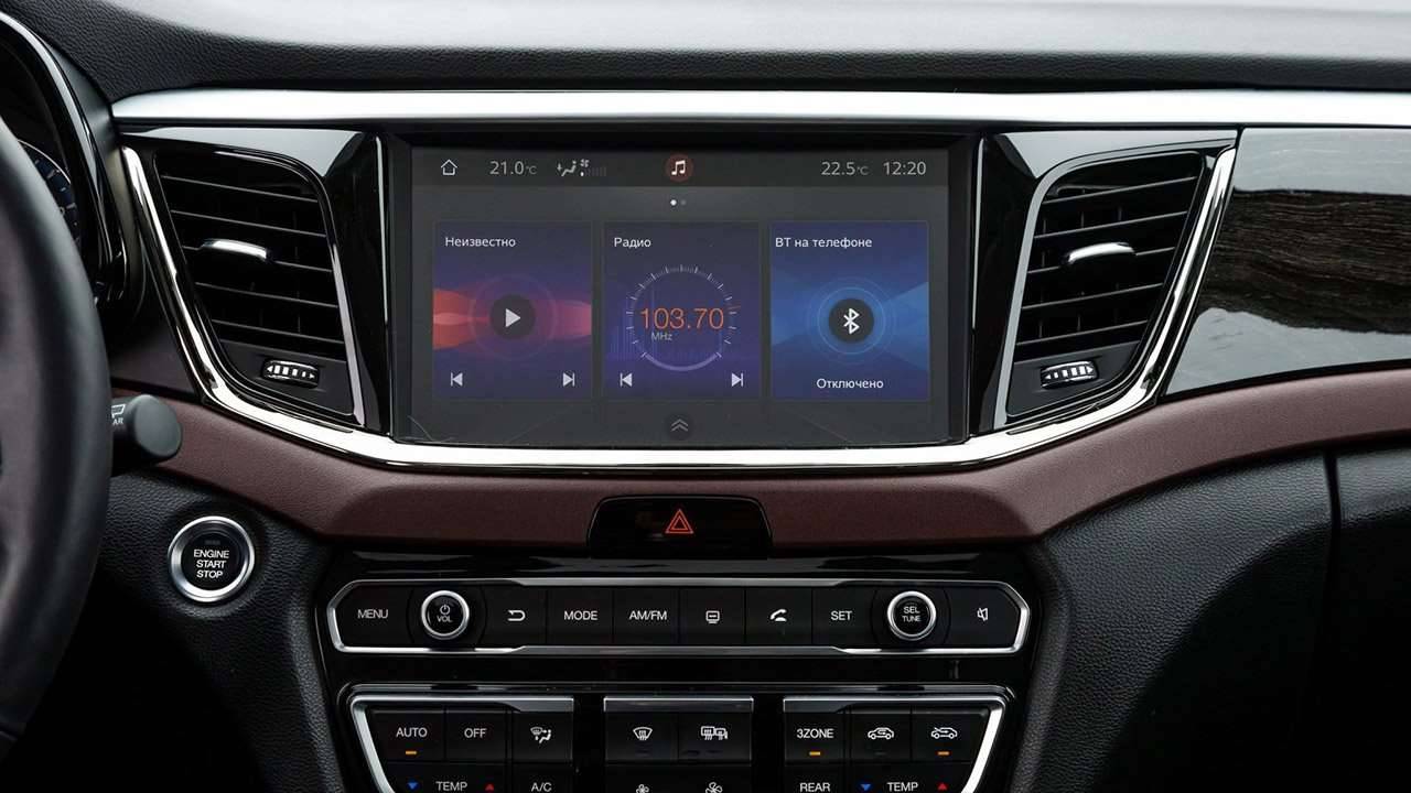 Интерьер кросса является премиальным, но достаточно аккуратным, без массы наляпистого декора, которым зачастую отличаются китайские модели. В отделке салона участвуют кожа, качественный пластик и металлические планки. Центральная консоль оснащена крупным дисплеем мультимедийной системы, а также блоком регулировок климат-контроля. А вот на тоннель производитель вынес массу кнопок управления функционалом, шайбу настройки режимов движения и селектор трансмиссии.
