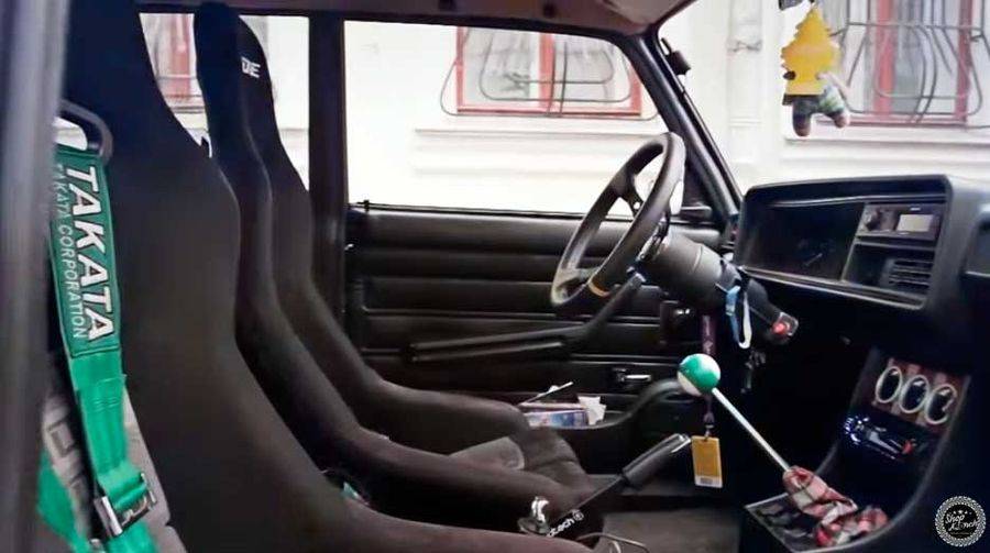Салон вмещает два спортивных ковшеобразных сидения, спортивный руль, трехточечные спортивные ремни безопасности, хорошую музыку..