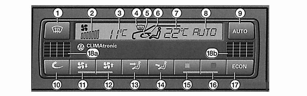 Нажатием клавиш 11/12 изменяются показания дисплея 2, клавиш 15/16 – показание 7, клавиш 9/11/17 – индикатора 8. Нажатие клавиш 10/13/14 приводит к изменению пиктограмм 4/5/6. Автоматический режим функционирования Климатроник можно изменить всеми управляющими клавишами. В инструкции по применению климат-контроля Фольксваген Бора и других моделей, оснащённых Climatronic, рекомендуется использовать режим AUTO с установленной температурой 22° С независимо от времени года и наружной температуры – такая настройка считается наиболее комфортной для водителя. Изменение режима допускается, если водитель или пассажиры предпочитают другие параметры микроклимата.