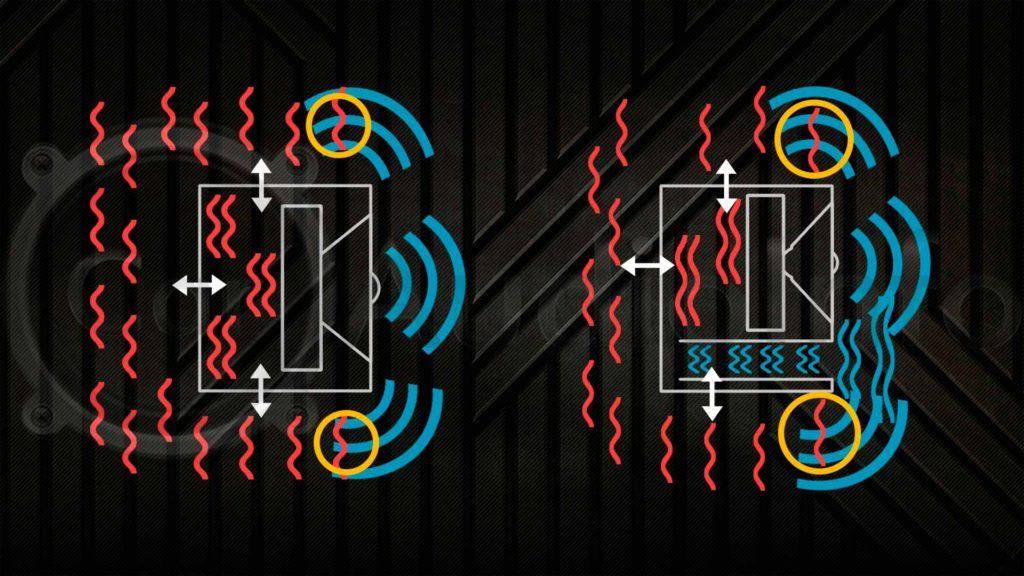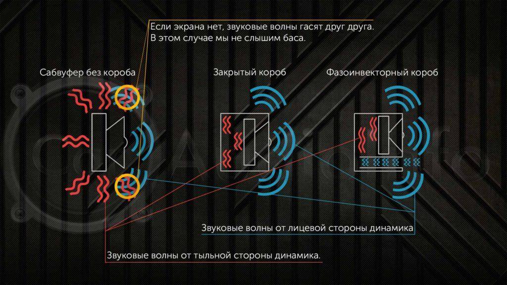 Если мы из короба работающего сабвуфера извлечём динамики, то обнаружим, что бас, который он качественно воспроизводил, исчезнет. То есть сабвуфер без короба (акустического оформления) не играет! Почему так происходит? Сабвуфер создаёт звуковые колебания в обе стороны, т. е. вперёд и назад. Если между этими сторонами нет экрана, звуковые колебания заглушают друг друга. Но если мы поместим сабвуферные динамики в закрытый ящик, то сможем разделить переднюю и заднюю часть сабвуфера и получить качественный звук. К слову, в фазоинверторе короб работает несколько по другому принципу, он воспроизводит звук в одном направлении, что увеличивает громкость по сравнению с З/Я примерно в 2 раза.