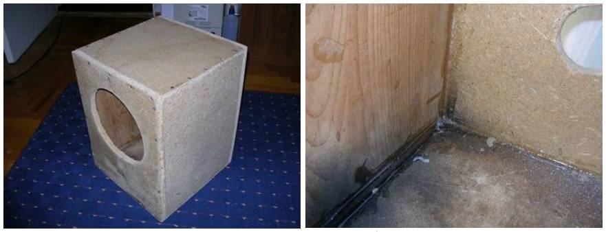 Сначала определимся с материалом, из которого будут сделаны стенки короба для сабвуфера. Желательно выбрать надежное ДВП и его толщина должна быть не менее 2 сантиметров. Стенки между собой соединяем при помощи шурупов размером 5 см, которые предварительно нужно смазать для надежности герметикой, которая не имеет цвета, а, значит, не испортит внешний вид. Теперь в местах скрепления нужно все тщательно промазать обычным клеем, всем известным ПВА. Его можно наносить побольше, для надежности и долговечности будущего сабвуфера.