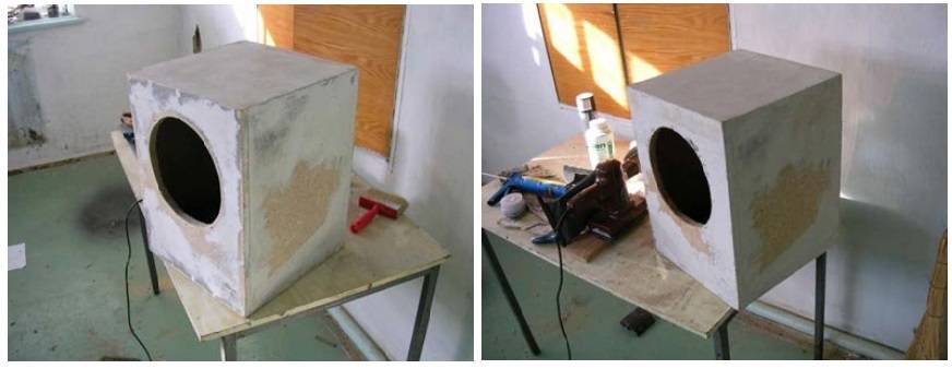 Далее понадобиться наждачная бумага. Поверхность делаем гладкой, отшлифованной. Так как шпаклевка может положиться не совсем ровно или неровно прибиты сами стенки, то здесь нужно воспользоваться уровнем. Если неровности не убрать и не вывести под уровень, дальше они будут видны и сабвуфер, сделанный своими руками, будет неаккуратным.